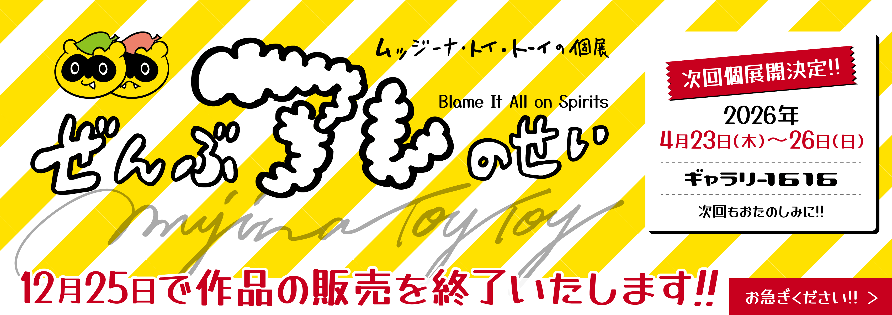 - 【MujinaToyToy個展終了しました!】MujinaToyToyの個展にご来場いただいた皆様、ありがとうございました。大盛況のうちに終了となりました!オンラインショップでは引き続き作品をお求めいただけます。次回は2026年4月に開催いたしますので、おたのしみに!